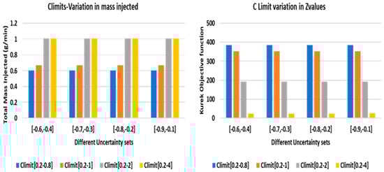 Similar to the previous sensitivity analysis, only case 1 from the Fossolo network study was considered. To understand the effect of regulation limit variations, four different regulation limits were considered: {[0.2, 0.8], [0.2, 1], [0.2, 2], [0.2, 4]}. The network was subjected to variations of the reaction rate coefficients {[−0.6, −0.4], [−0.7, −0.3], [−0.8, −0.2], [−0.9, −0.1]}, keeping the desired residual chlorine concentration = 0.5. The total mass injected into the system as well as the objective function values were compared using bar graphs, as shown in Figure 10. The width of the feasibility region also had a significant effect on both the mass injected as well as the objective function. We can see the correlation between the mass injected and the objective function values. When the feasibility region is narrow i.e., [0.2, 0.8], very little chlorine needed to be injected, but the penalty objective function was higher because it is difficult to control the residual chlorine and limit in that narrow feasibility range.