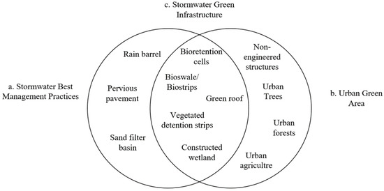 Defining stormwater green infrastructure practices. (a) Stormwater Best Management Practices are engineered practices, including both green and non-green components. (b) Urban Green Area includes both engineered and non-engineered practices that have green components. (c) Stormwater green infrastructure is at the intersection of these and includes engineered practices with green components.