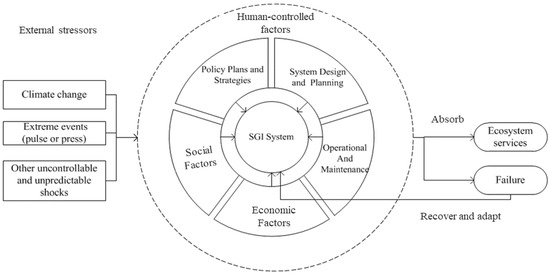 SWGI system. External stressors and human-controlled factors affect the resilience of SWGI. Five main factors that influence SWGI resilience are discussed in the paper (policy, design, maintenance, economic factors and social factors) and aspects within each are presented in Table 1. Resilience here has three different aspects: (i) resistance to the stressors lead the system to continue its basic functions and deliver ecosystem services as the system absorbs the stress. The system may also (ii) recover and (iii) adapt, in order to return to the stage to deliver the desired ecosystem services.