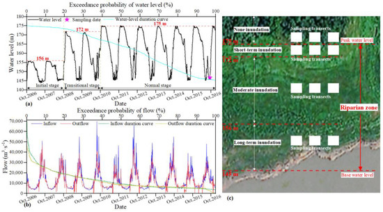 The water level hydrograph and water level duration curve in the Three Gorges Reservoir (a); the flow hydrograph and flow duration curve in the Three Gorges Reservoir (b); and schematic diagram of sampling design (c). Data on reservoir water level and flow were obtained from the China Three Gorges Corporation (http://www.ctg.com.cn/, accessed on 31 December 2016).