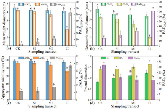 Aggregate stability indicators and aggregate destruction indexes at four sampling transects in the riparian zone of the TGR: (a) mean weight diameter of mechanically stable aggregates and water-stable aggregates and percentage of aggregate destruction of mean weight diameter; (b) geometric mean diameter of mechanically stable aggregates and water-stable aggregates and percentage of aggregate destruction of geometric mean diameter; (c) aggregate stability rate of mechanically stable aggregates and water-stable aggregates and percentage of aggregate destruction of aggregate stability rate; and (d) fractal dimension of mechanically stable aggregates and water-stable aggregates and percentage of aggregate destruction of fractal dimension. CK (none inundation, 175–180 m); SI (short-term inundation, 172–175 m); MI (moderate inundation, 156–172 m); and LI (long-term inundation, 145–156 m). Bars indicate standard deviation. Different letters (a, b, and c) indicate significant differences among four sampling transects at the p < 0.05 level (LSD).