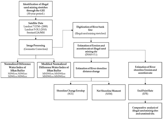 Flowchart diagram illustrating the methodology for evaluating erosion and accretion at mining sites. The diagram outlines the steps to analyze the satellite images and geospatial data, including spectral indices and a digital shoreline analysis system (DSAS) to calculate shoreline erosion and accretion rates.