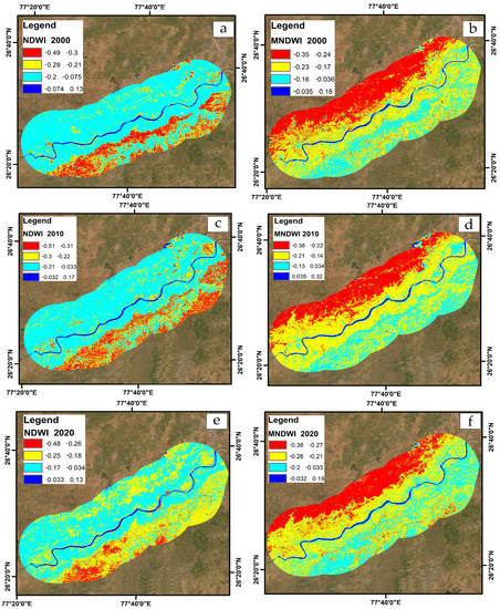 NDWI and MNDWI cover a 10 km riverbank buffer for 20 years. Remote sensing indices including the NDWI and MNDWI identify and map open water bodies such as rivers and wetlands and estimate water extent changes over time. (a) NDWI 2000, (b) MNDWI 2000, (c) NDWI 2010, (d) MNDWI 2010, (e) NDWI 2020, and (f) MNDWI 2020.