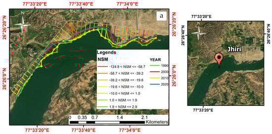 The net shoreline movement is calculated for all three illegal sand mining sites. As shown in Figure 6, NSM reports the distance between the oldest (1990) and youngest (2020) shorelines [43], with a negative distance indicating erosion and a positive distance indicating accretion in the river shoreline as shown in Figure 6. The percentage of all transects with negative and positive distances is mentioned in Table 3.