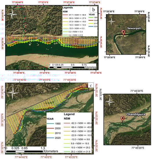 Sewarpali, Jhiri, and Chandilpura sites are famous for illegal sand mining (Figure 3). Therefore, 1 km upstream and downstream of these three mining sites and the stretches between these mining sites were selected for the present study to calculate the erosion and accretion of the riverbank line. On the other hand, a 1 km river stretch of the Chambal River under the village Basai Neem was selected as an unmined site in order to compare the rate of bank erosion between the mining site and the unmined site. Moreover, while selecting the unmined sites, we considered other bank erosion factors, i.e., bank materials, meander geometry, hydraulic variables, etc., that are more or less similar to the selected mining site in order to avoid biases.