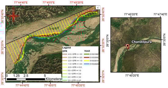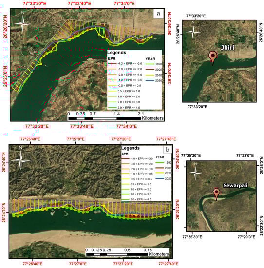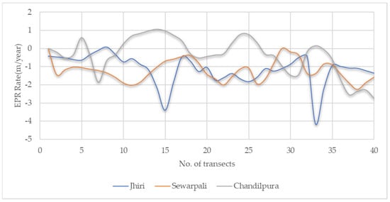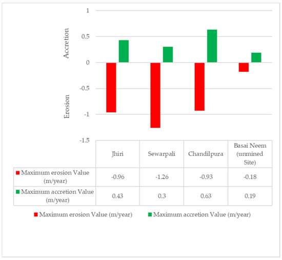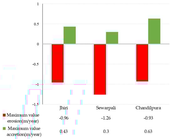 The EPR was determined by dividing the total distance by the time that the shoreline changed. This method determines movement yearly [38]. The endpoint rate map created for these three sand mining hotspots, as shown in EPR, showed riverbank erosion and accretion. The erosion and accretion rates of these three sand mining hotspots are shown in Figure 5, where a negative value indicates the erosion of the river shoreline and a positive value indicates the accretion along the shoreline. The erosion rate indicated the maximum value at the Sewarpali sand mining zone, which is calculated at 1.26 m per year, and the maximum accretion at the Chadilpura sand mining zone, which is 0.63 m per year. The endpoint rate profiles in the map profile also indicate the maximum erosion rate, as shown in Figure 7, and the comparative EPR rate, which shows the erosion and accretion of the riverbank, is shown in Figure 8.