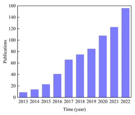 Among these sludge conditioning methods, biochar conditioning has received significant attention. Compared with other porous mineral materials, biochar can increase the permeability of sludge without reducing the calorific value of sludge, which is conducive to the incineration of dewatered sludge []. With the keywords “biochar” and “sludge” as search terms on the Web of Science (WOS), the total number of articles published in the past ten years is 700 (see Figure 1). In 2013, there were only 9 articles, while in 2022, the number of articles increased to 156. Some articles discuss using biochar made from agricultural wastes to assist sludge conditioning, and other articles review the application of biochar produced from sludge to improve sludge properties, which is an environmentally friendly sludge reuse style.