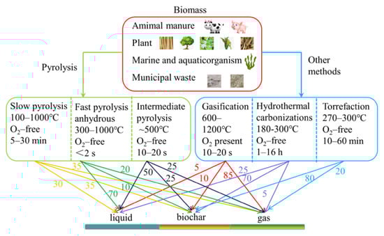Biochar is commonly prepared by some thermochemical treatments on different biomass, including pyrolysis, gasification, hydrothermal carbonization, and torrefaction [,,]. The major products in the thermochemical treatment of biomass include solid (biochar), liquid (bio-oil), and gas (syngas). Biochar from thermochemical treatment also has a high energy density. Figure 2 depicts the methods, conditions, and products for preparing biochar from different biomass, and the numbers next to the slashes in this figure represent the approximate percentages of the various products. Based on the heating rate, pyrolytic temperature, and residence time, the pyrolysis process can be classified as slow pyrolysis, fast pyrolysis, and intermediate pyrolysis []. Compared with fast pyrolysis, slow pyrolysis has a longer residence time but a larger biochar yield. The temperature and residence time required for intermediate pyrolysis are between the two above, and the biochar product is also in the middle. Gasification is the process of partial combustion of biomass in a high temperature range (600–1200 °C) with a short residence time (10–20 s) []. The main products of gasification are a gas mixture (CO, H2, and CO2) and a small amount of biochar []. Torrefaction usually refers to a mild dry pyrolysis process during which biomass is heated to a temperature of about 270–300 °C in an inert atmosphere for a residence time of 10–60 min []. This process results in about 80% of the biochar yield; the remainder is lost as gas. Hydrothermal carbonization (HTC), which is a wet torrefaction process, converts biomass into a carbon-rich solid product biochar []. In a confined system, the biomass is submerged in water and heated for 5–240 min at a temperature range of 180–300 °C and pressure of 2–6 MPa to complete the HTC process []. Compared to slow pyrolysis and dry torrefaction, the advantage of HTC is that it can operate in the presence of water and is not affected by the high moisture content of the biomass, eliminating the need to pre-dry wet biomass [].