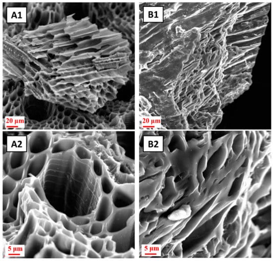 SEM image of biochar. The left is a maple sample (A1,A2) and the right is a spruce sample (B1,B2).