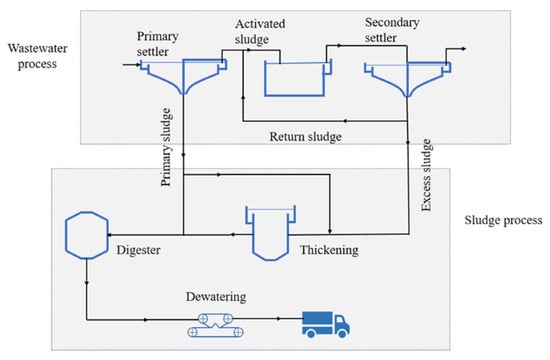 The WWTPs usually accept mixed water of domestic sewage and industrial wastewater, and the treatment method is mainly biological treatment, that is, the traditional activated sludge method and its deformation []. The wastewater and sludge treatment processes at the core of the activated sludge process are shown in Figure 4. Primary sludge and secondary sludge are produced in WWTPs. Primary sludge refers to the settleable solids in the primary sedimentation tank, including certain inorganic substances. Secondary sludge refers to the settled sludge after wastewater treatment with activated sludge, which is the result of net biological growth and accumulation of inert organic matter. WWTPs produce a large amount of sludge, even though it only accounts for 1% of the wastewater to be treated. The dewatered sludge still contains a high percentage of volatile solids and high water content, which results in a very large sludge volume. Sludge contains a large number of toxic and harmful microorganisms, bacteria, heavy metals, and various complex organic pollutants. If it is excreted and stacked at-will without proper treatment and disposal, it will cause serious secondary pollution to the water and atmospheric environment. More stringent local effluent regulations have brought about the increase of pipelines connected to WWTPs, the establishment of new plants, and the upgrading of old plants, and the final result is the continuous increase of sludge volume. A large amount of sewage sludge must be dewatered to reduce the volume of wet sludge before disposal via composting, landfill, drying, heat drying, or incineration. When the moisture in sludge is reduced to 50–60%, it can be disposed via composting, landfill, or incineration []. The current sewage sludge treatment process mainly focuses on the combination of thickening, digestion, and dehydration (Figure 4). Through thickening, the moisture content of activated sludge can be reduced from the original 99.5% to 94–96% []. In the process of sludge digestion, part of the organic matter is decomposed by anaerobic bacteria under anaerobic conditions, releasing methane and carbon dioxide. As a result, the sludge volume can be reduced by more than 50%, and the dewatering performance can be improved by 2–3% []. The dewatering method of sludge usually adopts mechanical dehydration, including vacuum suction filtration dehydration, pressure filtration dehydration, and centrifugal dehydration []. The dewatering performance of activated sludge is closely related to the previous sludge conditioning.