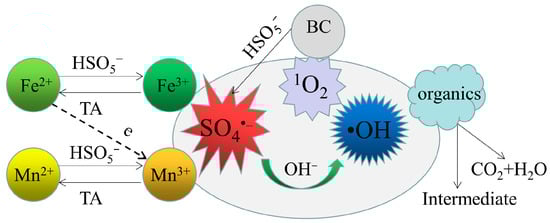 Yang et al. [] conducted peroxymonosulfate (PMS) activated by MnFe2O4-biochar (MFB) combined with tannic acid (TA) to improve sludge dewatering, and the SRF decreased by 83.68%. Figure 6 deduces the mechanism of sludge dewatering by MFB/PMS/TA. Firstly, the generation of some free radicals can oxidize the organic matter in the sludge and destroy the compact structure of the sludge. Then, Mn2+ and Fe2+ can activate PMS to generate sulfate radicals, and at the same time, they convert themselves into Mn3+ and Fe3+ (Equations (1) and (2)). Mn3+ and Fe3+ can be converted into Mn2+ and Fe2+, respectively, under the action of TA (Equations (3) and (4)). Namely, there are interconversions between different valence states of iron (Fe3+/Fe2+) and different valence states of manganese (Mn3+/Mn2+) in the sludge (Figure 6). Because the redox potentials of Fe3+/Fe2+ and Mn3+/Mn2+ are 0.77 and 1.51 V, respectively [], electron transfer would occur between Fe2+ and Mn3+ (Equation (5)). In addition, SO4−• could react with OH– to form •OH (Equation (6)). Biochar materials can also activate PMS to generate SO4−• or 1O2 []. SO4−•, •OH, and 1O2 are responsible for sludge degradation. Importantly, TA is a protein precipitant that binds to damaged cells in sludge microbes to form insoluble TA-protein complexes. Therefore, due to the advanced oxidation and the biochar skeleton and the composite of TA, the sludge dewatering performance was greatly improved.