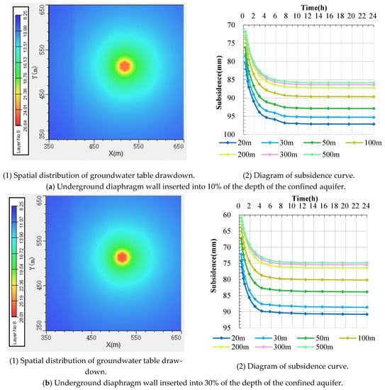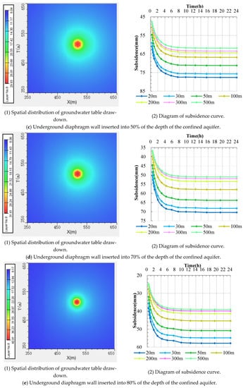 In this paper, we vary the depth of the underground diaphragm wall inserted into the confined aquifer from 10% to 100% of the depth of the confined aquifer. The distribution nephogram of the groundwater table drawdown and the subsidence curves are shown in Figure 7. It can be easily observed from the drawdown nephogram of the groundwater table that as the depth of the diaphragm wall inserted into the confined aquifer increases, the impact of foundation pit dewatering on the groundwater table drawdown outside the foundation pit decreases. The ground subsidence outside the foundation pit decreases as the drawdown of the groundwater table decreases.