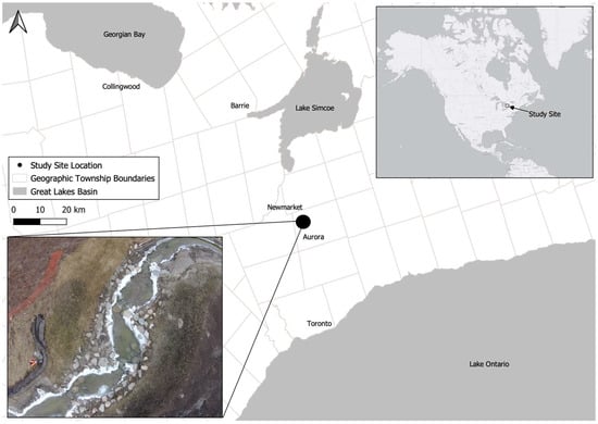Research was conducted at Weslie Creek, one of four major tributaries of the East Holland River, located in Aurora, Ontario, Canada (Figure 1). A section of Weslie Creek was restored following road improvements and removal of a dam. VRWs were used to provide channel and bank stability and facilitate fish passage for local species. The average annual temperature is approximately 6 °C, and the average annual precipitation is approximately 815 mm [24]. The peak discharge events are associated with snowmelt and spring rainfall, which typically occur from March to April and April to May, respectively. Based on the Water Survey of Canada (Station 02EC009; approximately 9 km from the study site), the 2018 mean annual discharge for East Holland River was 1.77 m3/s. This is above average compared to the mean annual discharge for East Holland River over the previous 10 years, which was 1.57 m3/s. According to the Ontario Watershed Information Tool (OWIT), the mean annual flow for the 9.5 km2 drainage basin containing Weslie Creek is 0.09 m3/s, as this is a small system.