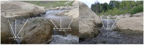 Velocity measurements were collected using a three-dimensional acoustic Doppler velocimeter (ADV, SonTek FlowTracker2) (+/−0.01 m/s). At each pool, the ADV was positioned perpendicular to the flow at 60% depth. Velocity measurements were collected every 10 cm from the left bank to right bank [26,27]. At each VRW (10 structures in total), velocity measurements were collected at active gap and/or over-weir flow pathways. Additionally, the pathway geometries were measured to characterize the passage area (Figure 2). Under intermediate and high water level conditions, where the gap and/or over-weir flow pathways were larger in width, multiple velocity measurements were collected across the pathway, and an average ‘cross-section’ velocity was identified for the associated pathway.