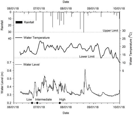 Daily rainfall, daily water temperature, and hourly water level along the study reach. Upper and lower temperature limits for fish species local to Weslie Creek are labeled on the water temperature graph [24]. Key field assessment days are shown with diamonds along the lower x-axis.