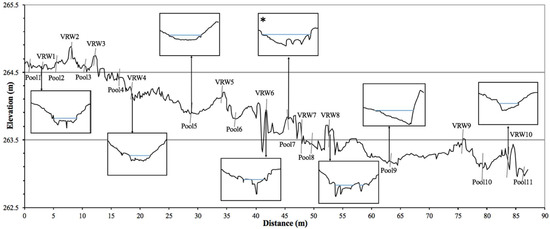 Reach profile from upstream (left) to downstream (right), with representative pool (above the profile line) and VRW (below the profile line) cross-sections. The asterisk in the pool 7 cross-section shows the location of the stilling well used. Vertical exaggeration is 0.08 m.