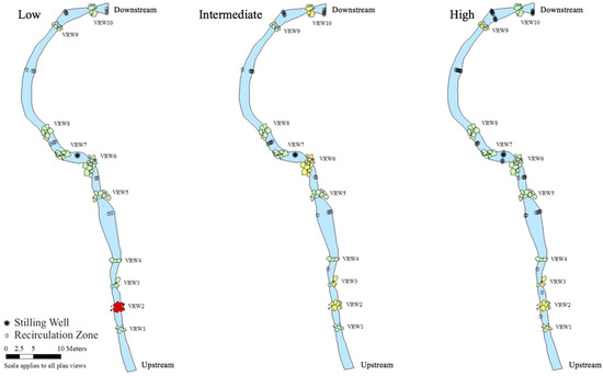 Based on fish passage suitability, the longitudinal connectivity throughout the reach was analyzed under low, intermediate, and high water level conditions (Figure 5). Under low water level conditions (June 22), 100% fish passage suitability (passable for all fish species) was achieved for all pool features and for 9/10 VRWs (Figure 5—Low). Under low water level conditions, there was no gap or over-weir flow throughout VRW2, which restricts fish passage (Figure 5—Low). Under intermediate water level conditions (June 28), 100% fish passage suitability was achieved for all pool features and for 6/10 VRWs (Figure 5—Intermediate). Under intermediate water level conditions, the gap and over-weir flows at VRW2, VRW3, VRW6, and VRW10 exceeded the burst swim speeds of one or more local small-bodied fish species. However, one to three pathways were available for faster swimming species (Figure 5—Intermediate). Under high water level conditions (July 25), 100% fish passage suitability was achieved for all pool features and for 6/10 VRWs (Figure 5—High). Under high water level conditions, the gap and over-weir flows at VRW1, VRW2, VRW3, and VRW9 exceeded the burst swim speeds of one or more local small-bodied fish species. However, one to two pathways were available for faster swimming species (Figure 5—High).