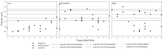 According to Lucas and Baras [17], river restoration efforts (such as fishways) should provide 90% overall passage efficiency for diadromous and potamodromous fish species to be considered functional. Fish passability through a reach is a function of three components: appropriate water depth, velocity, and gradient for leaping [31]. The results of this research suggest that fish passability through a reach is most effective and longitudinal connectivity is most complete under low flow conditions, which is the most frequent condition (Figure 5). This is due to the number of active gaps available for fish passage. Although not all gaps facilitated suitability velocities for local small-bodied fish passage, 9/10 VRWs had at least one suitable pathway. With 90% overall fish passage suitability based on local velocity measurements, the VRWs at Weslie Creek are considered functional under low water level conditions. Excessive velocities through flow pathways that inhibit fish passage upstream are recognized as the most likely cause of passage failure and non-functionality for VRW systems [43].