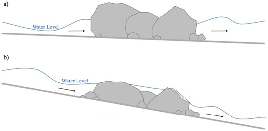Depending on site-specific water level characteristics, design considerations should be applied to construct VRWs with a suitable level of embeddedness, such that there are opportunities for ‘drowned conditions’ to enhance fish passage suitability. For example, Weslie Creek experiences low water level conditions for the majority of the year, and as such, VRWs should be constructed with a high degree of embeddedness for maintaining longitudinal connectivity (Figure 5). However, in systems characterized by high water level conditions, constructing VRWs that can withstand ‘drowned conditions’ is likely more important than embeddedness. If ‘drowned conditions’ are more common in these systems, longitudinal connectivity and fish passage suitability would increase throughout the reach. In terms of embeddedness, it is important that the material size used for constructing VRWs is large enough to maintain stability in higher-magnitude flows (e.g., Q10–20) [36] but small enough to remain embedded. These dimensions are based on site-specific characteristics, as well as requirements for the target fish community, to ensure passage is possible at critical times (i.e., spawning periods). Similar to the VRW gradient and keystone characteristics, assessing embeddedness under low water level conditions has the potential for use as a method to preliminarily and rapidly monitor fish passage suitability (in terms of drowned conditions) without conducting extensive in-field data collection.