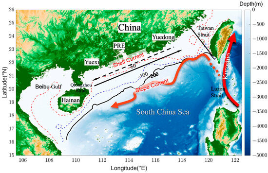 Over the Northern South China Sea (NSCS), the shelf circulation and water movement experience complex dynamics driven by wind, tides, the Kuroshio intrusion, freshwater discharge from the Pearl River Estuary (PRE), and modulated by the local topography [9,10]. The alternate variation of northeasterly winter monsoon to southwesterly summer monsoon induces contrasting seasonally changed southwestward to northeastward shelf current and a strong seasonal difference in rainfall over southern China and related buoyant discharge into the NSCS, which together impacts water exchange rates and thus the ecological balance of the region [11,12]. Under the interaction of topography and summer southwesterly wind, extensive upwelling was generated at the coastal region of NSCS and brings cold, salty, nutrient-rich deep waters to the surface and therefore, improves the primary production in these regions [9,13,14]. Although previous studies have recognized the influence of the East Asia Monsoon on the NSCS’s hydrodynamic processes, indicating substantial seasonal variability [15,16,17], the specific seasonal patterns of water exchange, the major hydrodynamic processes, and their cumulative impacts remain poorly understood.