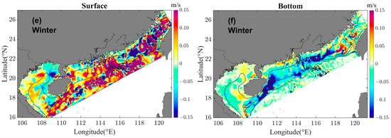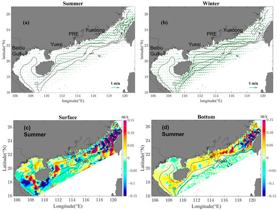 The circulation patterns in the NSCS shelf exhibit marked seasonal variations, closely linked to monsoonal influences and regional geomorphological features (Figure 2), meanwhile the Kuroshio intrusion through the Luzon Strait fosters a cyclonic slope current that serves as the dynamic boundary delineating the shelf circulation [42]. During the summer, the shelf current is directed northeastward under the influences of the southwesterly monsoon. Along the Yuexi coast that to the west of PRE, the northwestward coastal current to the west of PRE was largely reduced under the influence of the westward expanded plume from PRE. The river plume that comes from the PRE is mainly affected by the winds that drive currents along the coast. Additionally, the natural buoyancy within the plume plays a crucial role in altering the circulation of water both along the shore and across the shelf, especially in the upper layers of the water column. At the estuary mouth, the interaction of Pearl River Plume and shelf current induced the intrusion of shelf current [43,44]. It is also noticed that, during summer, the cyclonic slope current intruded into the shelf through the region to the southeast of Hainan Island and joined the shelf current (Figure 2a). On the surface, the complicated cross-isobath transport patterns occur around Hainan Island, but the bottom onshore intrusion prevails over the shelf due to the flow-topography interaction [10,45] (Figure 2c,d). Conversely, during winter, the shelf current intensifies and assumes a southwestward flow. Associated with the intensified northeast wind, the surface water mainly features the onshore intrusion, while the strong bottom offshore transport covers the whole shelf (Figure 2e,f), particularly to the southeast of Hainan Island. The cross-shelf velocities are instrumental in establishing the dynamic connection between the shelf current and the basin-wide circulation [26,46], and these velocities, combined with the observed seasonal circulation patterns, emphasize the complex interplay between shelf and basin dynamics in the region.