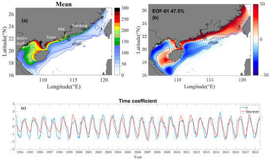(a) The annual mean distribution of the depth-averaged in NSCS. (b) EOF leading mode of . (c) Time coefficient of the leading mode of and time coefficient of the leading mode of sea level.