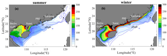 To check the seasonality of the in the NSCS, it was averaged in the summer and winter time during the simulation period. During the summer months, the robust northeastward shelf current initiates an active water exchange (Figure 2a), the substance released in the northeast shelf can leave the NSCS rapidly through the Taiwan Strait, thus diminishing values along the northeast shelf. From the Taiwan Strait, there is a notable southwestward increase to approximately 200 days near Qiongzhou Strait (Figure 4a). The Beibu Gulf experiences complex interactions between anti-cyclonic circulation in its southern reaches and cyclonic circulation in the north (Figure 2a), causing values to rise from the mouth of the bay toward the gulf’s northeast and reach the largest exceeding 300 days. Meanwhile, the water motion is relatively weak, and induces the larger values at the top of the Beibu Gulf.