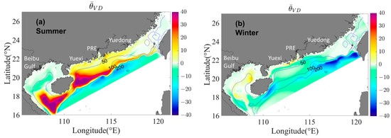 In contrast, during winter with northeast wind forcing and intensified southwest shelf current, it mainly features the surface onshore intrusion and bottom offshore transport, particularly over the southeast of Hainan Island and shelf out of PRE. Thus, the downwelling results in the exchange rate of the bottom water being slightly faster than the surface water with the negative over the whole shelf NSCS (Figure 5b). However, although the magnitude of the cross-isobath transport is stronger in comparison with the summer, the magnitude of the negative is much smaller. The large is only observed near the 200 m isobath and southeast side of Hainan Island.