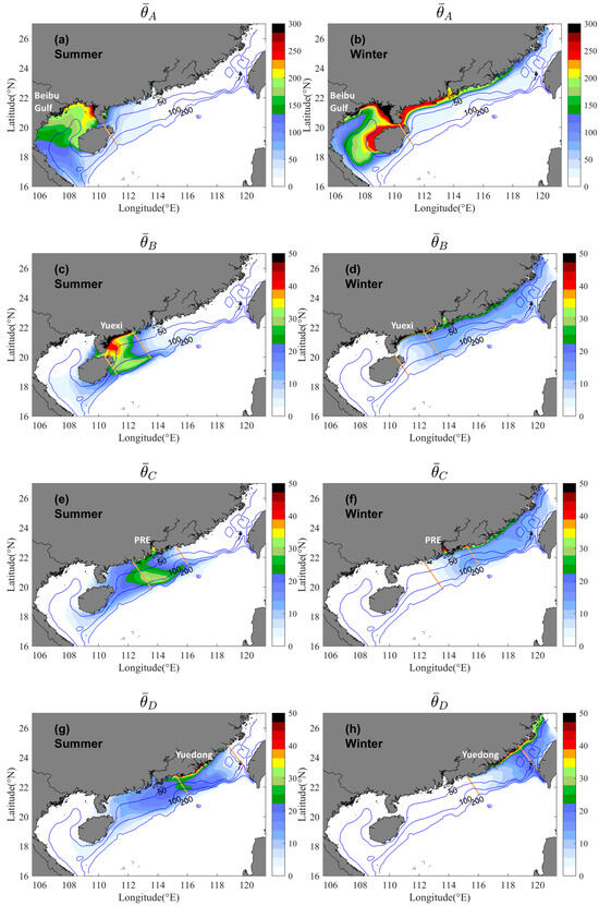 As shown in Figure 6, in the semi-closed Beibu Gulf, the water motions are limited and water exchange rate are relatively low, thus lead to a pronounced increase of , which indicates the time of water stayed in Beibu Gulf is relatively long than the other regions. The increases from 50 days at the mouth of the gulf to exceed 300 days in the northeast (Figure 6a,b) in both summer and winter, and it has larger contribution to the total . Outside the Beibu Gulf, in summer, there is an extension of (~50 days) towards the PRE, potentially indicates a southwestward movement along the coast that against summer wind. Another branch of extension of expanded along the 100 isobath, indicates the westward transport due to the stable slope current. In winter, high values of could spread to the coastal areas of Region D, which suggests that, by overriding the shelf current, waters from distant coastal region can arrive the Beibu Gulf.