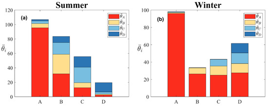Based on the values of in regions A–D, we could examine the contribution of each to the overall (Figure 7). The x axis and axis of the bar charts in Figure 7 indicates the different subdomain and the various , respectively. During summer (Figure 7a), generally, it shows substantial contribution of the initial release locations, which means the substance released on the shelf trends to stay in the initial release locations for longer time. Such as the contribution of exceeds 80% in region A itself. The large contribute of in Region B and C illustrates a quite strong westward transport, contrary to the prevailing wind and shelf current direction. Even under the northeastward wind forcing and shelf current, the accounts for approximately 30% and 20% in regions B and C, respectively. In winter (Figure 7b), the strong southwestward shelf current significantly influences the distribution. The which means the time stay inside the Beibu Gulf, has a significant contribution to all the subdomains, with ratios exceeding 50% in regions B and C and. Even in the region D that quite away from Beibu Gulf, contributions from reaches 50%. This illustrates the extensive interaction facilitated by shelf circulation, suggesting that the Beibu Gulf marine environment could be affected by the entire NSCS shelf regions.