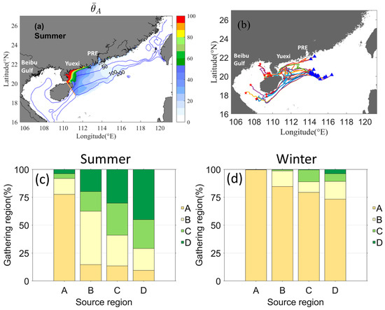 (a) Depth-averaged in summer but ignored the values in Beibu Gulf. (b) The trajectories of particles released in the summer. The blue triangles and red stars denote the locations of particles on the 0, 60 days after their release, respectively. (c,d) Distribution of the particles that released from different regions during summer and winter.