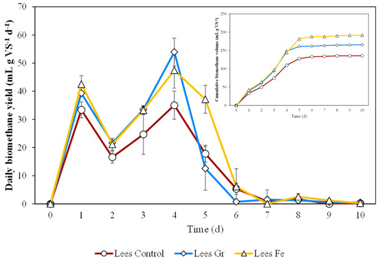 The daily CH4 production is shown in Figure 2. The control trial without particles yielded 136 mL CH4∙g SV−1 at the end of the essay; whereas, the addition of microparticles increased this value until 166 mL CH4∙g SV−1 for Lees Gr and up to 192 mL CH4∙g SV−1 in the case of Lees Fe. CH4 production in the tests was registered during the first 6 days of operation, declining from Day 5 onwards. Daily methane production has been virtually nonexistent since Day 8 of incubation. The lag phase for all three trials was minimal addressing production figures without significant differences among the essayed conditions. The detected values of methane production were in the range of previously reported studies for these kinds of substrates, which reported values between 100 and 350 mL CH4∙g SV−1 using wine lees in batch anaerobic experiments [49,50,51]. In Table 4, the biomethane production performance of wine lees as an organic substrate is displayed in comparison to other agricultural waste substrates of different origins, confirming a standard yield per unit of volatile solids and adding value to the management of this wine by-product.
