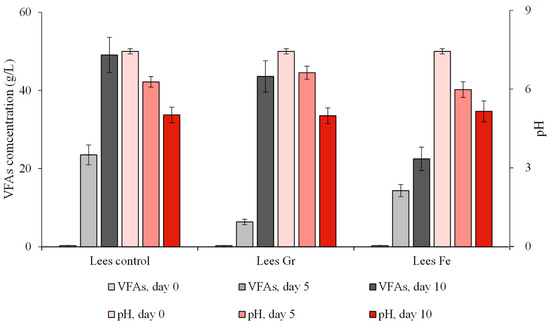 VFA concentration was measured on Test Days 0, 5, and 10, as illustrated in Figure 3, revealing a notable increase in VFA concentration throughout the experiment. This growth may be attributed to the slower degradation of VFAs by acetogenic and methanogenic microorganisms compared to their production by acidogenic microorganisms [72]. In the trials involving graphite microparticles, a reduced accumulation of VFAs was detected, particularly during the initial 5 days, as compared to the control test. Between Days 5 to 10, VFA accumulation was lower in the Lees Fe trials than in the Lees Gr trials, contributing to producing a higher CH4 yield compared to graphite microparticle addition essays. At the end of the experiment, all trials exhibited a VFA concentration exceeding 20 g∙L−1 by the 10th day of the processes. Although the presence of microparticles promoted a higher conversion of VFAs to methane, this positive effect was insufficient to circumvent the negative effects produced by VFA accumulation in the methanogenic stages of AD processes.