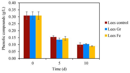 The accumulation of phenolic compounds in the medium could be another factor influencing the inhibition of the process [73,74]. The initial measured value exceeds 0.3 g∙L−1 (Figure 4), suggesting a potential mild impact on the process according to [13]. Other studies have reported that inhibition in anaerobic digestion can occur when the concentration of phenolic compounds surpasses 0.1–0.6 g∙L−1, leading to high system instability and, consequently, reduced biogas production [9,75,76]. Figure 4 illustrates a decline in the phenolic compound content in the medium throughout the essay, which, in this instance, does not appear to be a greater adverse effect than VFA content or pH value. After 10 days of testing, the reduction in the phenolic compound content in all three treatments, with and without microparticles, reached about 65%. This reduction may also be attributed to the substantial dilution of the wine lees substrate in the medium. Although lees hold a phenolic compound content of 1.59 g∙L−1 (Table 1), it decreases to 0.3 g∙L−1 after being mixed with the WWTP sludge at the beginning of the trials. No significant effect of the microparticles’ presence was detected over the phenolic compound concentration (Figure 4).