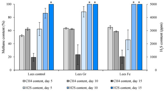 Time course evolution of the biogas composition (CH4 and H2S) along BMP experiments, with and without microparticle addition, from the anaerobic digestion of wine lees. The asterisk indicates that the H2S measurement has arrived at the maximum value measured by the gas analyzer.