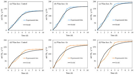Biomethane generation (mL) per quantity of volatile solids (g) for wine lees, with and without microparticle addition, in the anaerobic digestion of wine lees in a BMP experiment under mesophilic conditions. Gompertz modeling (a–c) is represented in the blue color, and first-order modeling (d–f) is represented in the orange color.