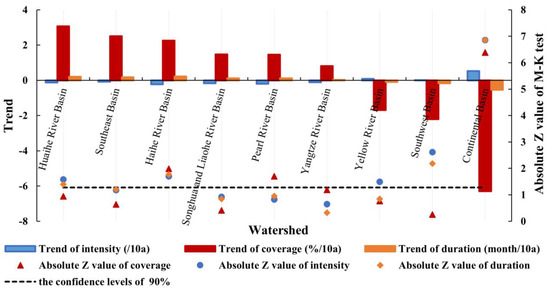 Trend values and absolute Z values of the hydrological drought characteristics in the nine major river basins in China.