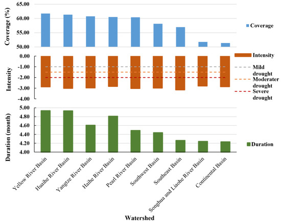 Multi-year average of the hydrological drought characteristics values in the nine major river basins in China.