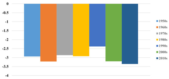 In Figure 5, it also can be found from Figure 5 that the drought situation in China was severe in the 1950s and 1960s, gradually reduced in the 1970s, 1980s, and 1990s, and the drought situation was the lightest in the 1990s. After entering the 21st century, the drought situation began to worsen sharply. Therefore, the current situation of hydrological drought is severe, and the government needs to strengthen disaster prevention and reduction.