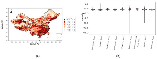Further analyzing the spatial distribution characteristics of hydrological drought in China, Figure 6a,b indicate that the hydrological drought intensity in China ranges from −15.13 to −0.83. Most regions in China have experienced relatively severe hydrological drought (with an average intensity above −2.0). Some areas in the southeastern part of China have encountered severe hydrological drought (with average intensities ranging from −3.22 to −15.13). The Continental Basin exhibits the widest range of hydrological drought intensity values, ranging from −15.13 to −0.83. Within the basin, approximately 5.53% of grid points have hydrological drought intensities ranging from −15.13 to −3.09, and these grid points are primarily located in the central part of the Inland River Basin. About 45.05% of the basin’s area experiences relatively mild hydrological drought conditions (above −2.0 in intensity). The Southwest River Basin also exhibits a relatively wide range of hydrological drought intensity values, ranging from −9.77 to −1.62. Grid points with hydrological drought intensities between −9.77 and −3.69 are less common, accounting for approximately 1.87%, and these grid points primarily located in the western part of the Southwest River Basin. The main distribution of the hydrological drought intensity in the basin falls between −3.69 and −2.00, covering approximately 97.97% of the total area.