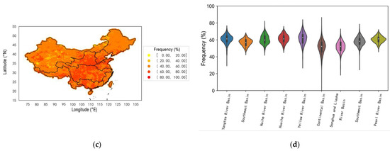 Based on Figure 6c,d, it can be observed that the multi-year average hydrological drought frequency in China ranges from 1.49% to 83.58%. The Yellow River Basin has the highest average hydrological drought frequency (61.72%), followed by the Huaihe River Basin (61.35%). The other basins, ranked in descending order of the average hydrological drought frequency, are the Yangtze River Basin (60.73%), Haihe River Basin (60.50%), Pearl River Basin (60.40%), Southwest River Basin (58.12%), Southeast River Basin (56.96%), Songhua and Liaohe River Basin (51.78%), and Inland River Basin (51.40%). The Continental Basin exhibits the widest range of multi-year average hydrological drought frequency values, ranging from 1.49% to 83.58%. Areas with frequencies below 40% are primarily located in the central and eastern parts of the Inland River Basin, while areas with frequencies above 60% are mainly distributed in the western, central, and southeastern parts of the Inland River Basin. The majority of the basin’s areas have frequencies ranging from 40% to 60%.