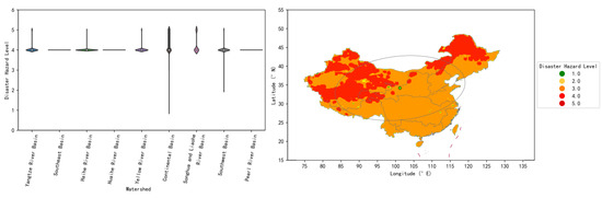 Figure 7 displays a violin plot and a spatial distribution map of the hydrological drought hazard levels in China over 66 years (1948–2014). In the figure, green represents low hazard levels, khaki represents relatively low hazard levels, orange represents moderate hazard levels, red represents relatively high hazard levels, and deep red represents high hazard levels. GeoPandas’ spatial visualization tools and standardized disaster risk indexes are used to create a nationwide high-precision spatial distribution map of the hydrological drought hazard levels in China. Standardized indexes provide spatial comparability and enable an objective assessment of the hazard levels for each pixel. The standardized index offers spatial comparability and enables an objective assessment of the disaster risk levels in various geographic units.