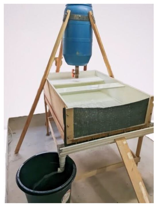 The tests conducted to determine the filtering efficiency and flow rate of the geosynthetics were carried out following ASTM D5141-11 [26], which allows for the calculation of filtering efficiency and material flow rate. Modifications were made to the protocol for this study to adapt it to the available conditions in three respects: homogenization of the samples before discharge, filtration of the effluent to determine the mass of soil passing through the geosynthetic and turbidity measurement.