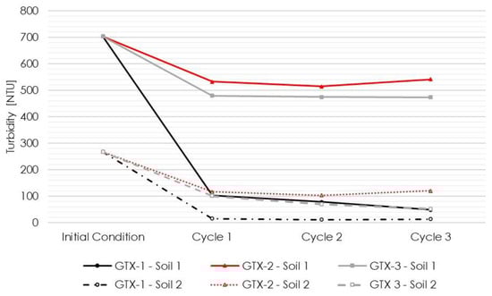 GTX-3 showed the same trend as GTX-2, where there was no substantial reduction in turbidity for soil 1 (around 33% reduction). However, for soil 2, a decrease in turbidity was noted, reaching a reduction of around 80% after the third cycle. The same explanations can be associated with the phenomenon; however, as the pore opening size was a little smaller, the retention process was better.
