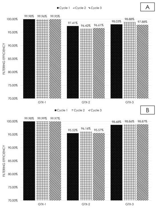 Filtering efficiency throughout discharge cycles examined for the two tested soils across the three evaluated geotextiles. (A) Soil 1. (B) Soil 2.