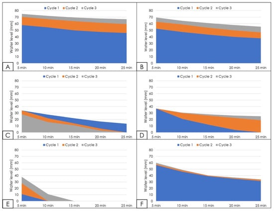 Water level throughout the test. (A) GTX-1, soil 1. (B) GTX-1, soil 2. (C) GTX-2, soil 1. (D) GTX-2, soil 2. (E) GTX-3, soil 1. (F) GTX-3, soil 2.