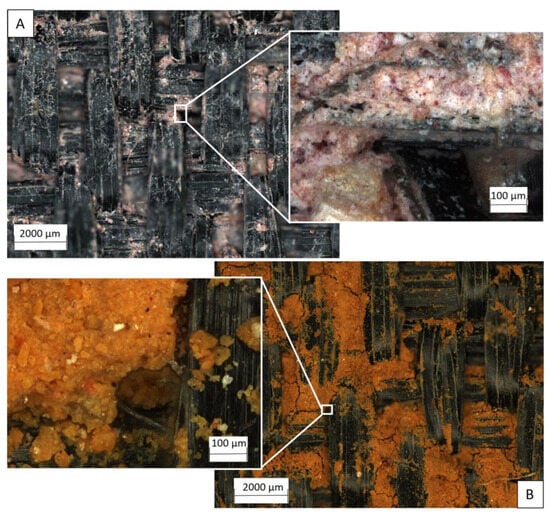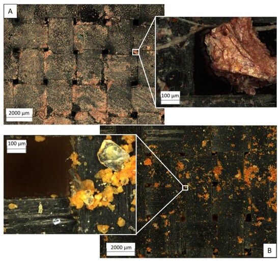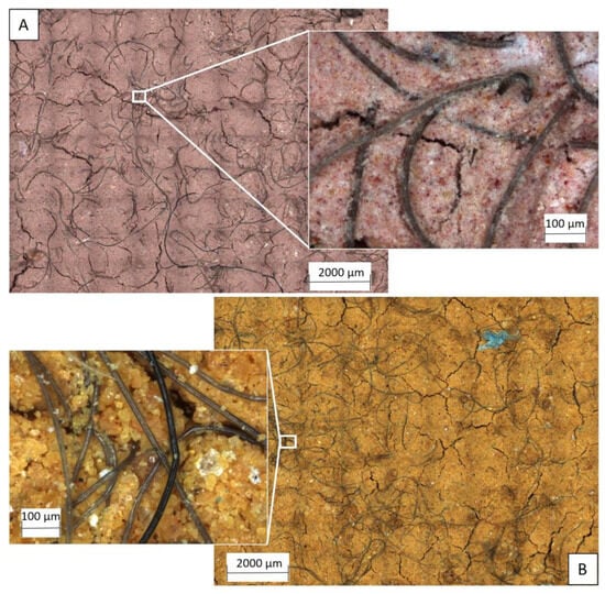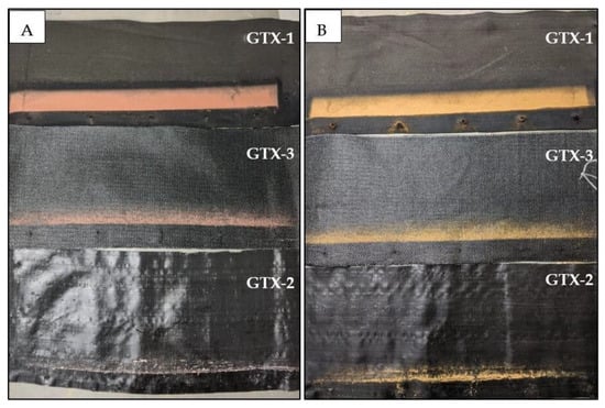 Details of soil impregnation in the geotextiles after the third cycle—GTX-3. (A) Soil 1. (B) Soil 2.