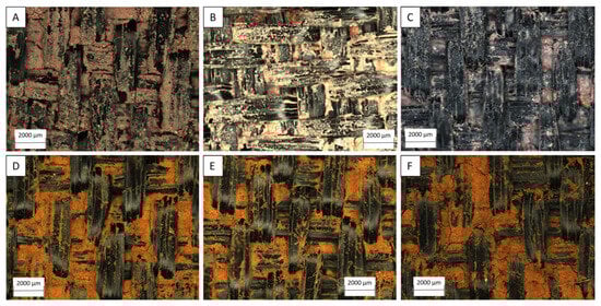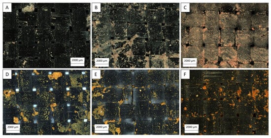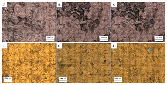 Map of photos taken with the optical microscope—GTX-3. (A) Soil 1, cycle 1. (B) Soil 1, cycle 2. (C) Soil 1, cycle 3. (D) Soil 2, cycle 1. (E) Soil 2, cycle 2. (F) Soil 2, cycle 3.