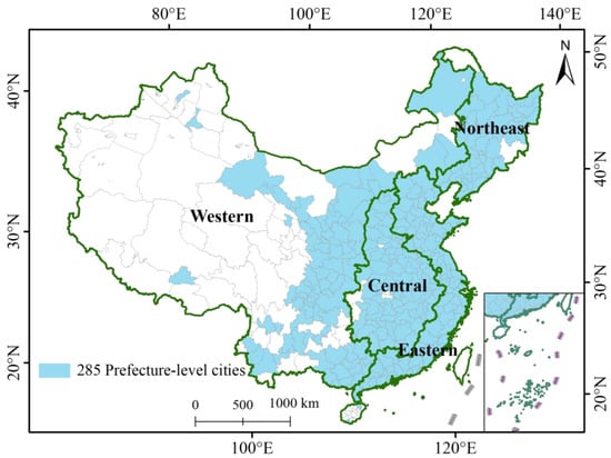 For this study, data from 285 prefecture-level cities in mainland China were utilized (Figure 1) from 2007 to 2020. Hong Kong, Macau, Taiwan, and other cities, particularly in western China, were excluded due to the unavailability of relevant data. In this paper, “cities” refers to prefecture-level cities in China. They constitute the second level of administrative structure, located below the province and above the county level. Prefecture-level cities consist of multiple districts, county-level cities, and counties. In 2007, there were 285 prefecture-level cities in China. To maintain consistency, this study used 285 cities in 2007.
