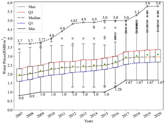 Boxplots showing urban residents’ domestic water prices from 2007 to 2020.